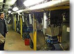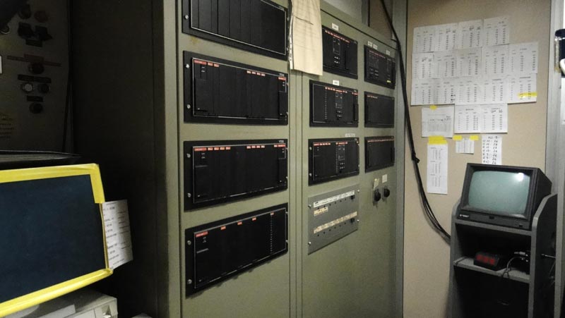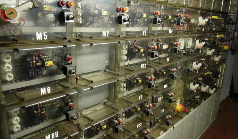 Im Vorbeigehen werfen wir noch einen Blick auf eine der zahlreichen Strom-Unterverteilungen. Hier fällt auf -neben der vorbildlichen Ordnung und Sauberkeit- dass es sich um Schütze handelt, die aus der Leitwarte ferngesteuert werden. Oder dachten Sie, dass hier immer einer stehen muss, um die Hebel zu bedienen? Das sind glücklicherweise nur die Hauptschalter, die im Betrieb nicht berührt werden dürfen. Selbst hier im Untergeschoss können wir bereits lernen, dass alle technischen Abläufe fernüberwacht und computergesteuert werden. Dass hier viele Jahre lang tüchtig investiert wurde, ist nicht zu übersehen.