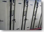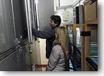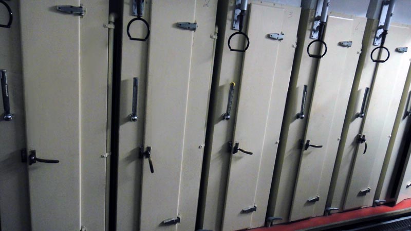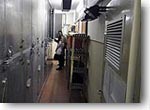 Nach dem eigentlichen Gießvorgang muss der Film -mit klebrig-warmer, feuchter Emulsion beschichtet- erst einmal abkühlen und trocknen. Dazu durchläuft er verschiedene Klimazonen innerhalb dieser Trocknungsschränke - ähnlich den kleinen Stationen zur Probenherstellung in diesem Bericht zuvor. Hier freilich in einem kontinuierlichen und vollautomatischen Prozess ohne Eingriff von außen. Nicht nur Feuchtigkeit und Temperatur werden kontrolliert - auch der Luftdruck spielt hierbei eine wichtige Rolle. So gleitet die Filmträgerseite auf einem Luftpolster über die fein gelochten Führungsbleche in den Trocknungsschränken auf und ab - die Emulsion berührt dabei nicht ein einziges Element. Diese verhältnismäßig kompakte Bauweise der Trocknungsstufe erfordert ein sehr exaktes Einhalten aller Zu- und Abluftparameter um weder den Filmtransport noch das Aushärten der Emulsion zu gefährden. Technik und Fachwissen pur! Da kommt FilmFerraniaFreude auf.