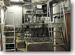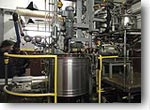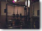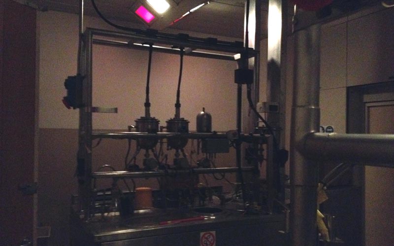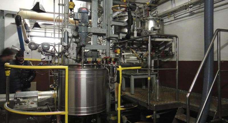 Hier haben wir in eine der vielen kleineren Emulsionsküchen gelinst. Das Rotlicht war noch an, es roch nach allerlei chemischen Substanzen. Erst kürzlich wurde hier noch ein neuer Test vorbereitet. Also nicht die Finger in die Töpfe stecken. Es könnte gefährlich sein. Da in diesen Bereichen oftmals mit leicht flüchtigen, giftigen oder gar hochentzündlichen Stoffen gearbeitet wird, gilt der besondere Augenmerk auch der Entlüftung. Nicht zuletzt auch zum Schutze der Mitarbeiter! Ferner sind elektrische Anlagen in explosionsgeschützter Ausführung vorhanden (Motoren, Schalter, Pumpen besonders gekapselt) - oder die Prozesskontrolle (Ventile, Rührwerke etc.) wird gleich mit Druckluft betrieben, um die Möglichkeit elektrischer Funkenbildung zu minimieren.