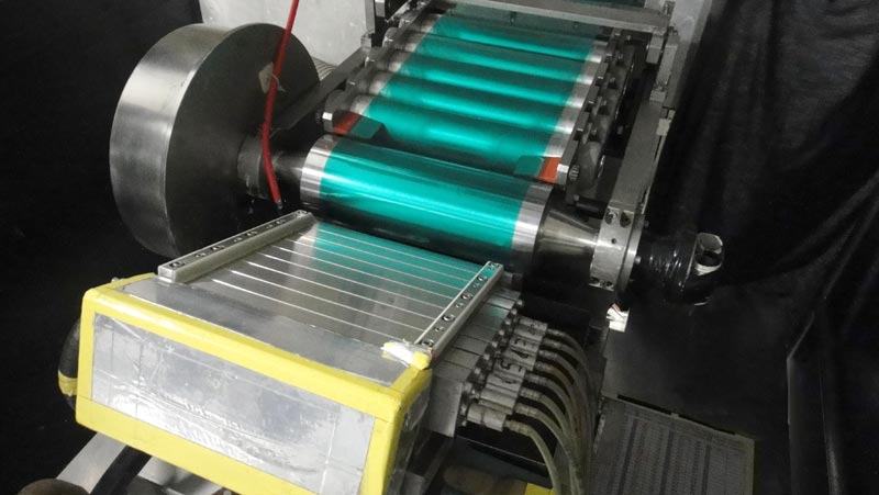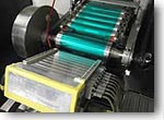 Hier nochmals ein Blick auf das Herzstück der Anlage: den Gießkopf. 8 Schlitze, 8 Schichten - wenn gewünscht. Im Betrieb wird er hydraulisch an den Filmträger herangefahren. Hier befindet er sich in seiner Wartestellung vor dem Anguss/Antauchen. Austretende Emulsion aus dem Vorlauf kann nach unten in eine Auffangwanne ablaufen, bis der Operator den Gießprozess startet. Die beiden anderen Bilder zeigen Ab- und Aufwickeleinrichtung des Filmträgers. In diesem Falle nur grüner Leaderfilm, der in die Maschine vor und nach jedem Guss eingezogen wird. Man möchte möglichst nie "neu einlegen" müssen. Das wäre sehr aufwändig. Die Aufwickeleinrichtung besitzt -wie auch der Filmlauf innerhalb des Coaters- zahlreiche Sensoren zur Qualitätskontrolle. Einer davon überprüft die Gleichmäßigkeit der aufgetragenen Schicht - eine Ferrania eigene Entwicklung. Sie macht sich das elektrische Feld bzw. dessen Störung durch vorhandene Masse zu Nutze und zeichnet so ein Bild von der aufgetragenen Schicht und deren Verteilung.