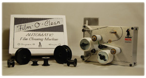 Film-O-Clean is a self-contained film cleaning machine which mounts both on a movie projector to clean as you project, and on a bench for cleaning between rewinds.
