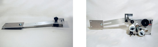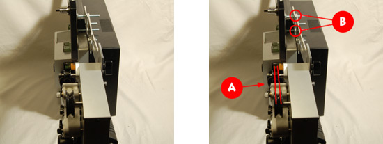 | 6. Hold Film-O-Clean and center the Drive Wheel within the film path. Align the Support so it "touches" the two front bolts at 90 degrees ( photo "A"). |