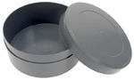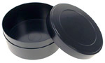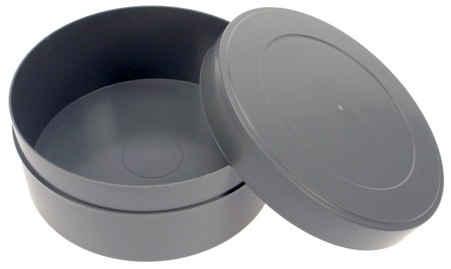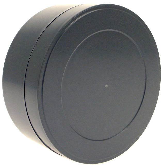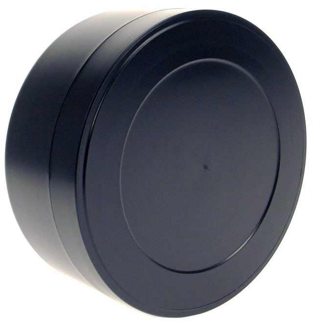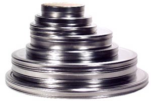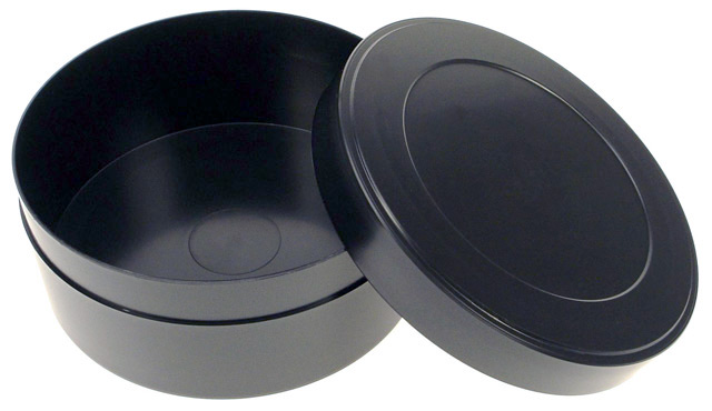 Euro Filmdose 120m/16mm Weißblech, Höhe 29,5mm, Durchmesser 184mm. Deckel geprägt und mit eloxiertem goldfarbenem Rand.