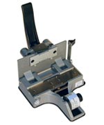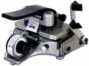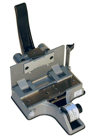 Stumpfklebepresse CIR Catozzo M.3 16mm Mod. 2T Spezial, mit geradem Schnitt im Bildstrich für 16mm Bildfilm stumm, Licht- und Magnetton sowie Schrägschnitt für 16mm Magnetfilm (Cordband). Neues Modell mit verstellbaren Perfo-Fixierstiften (um auch geschrumpftes Filmmaterial präzise verarbeiten zu können), vergrösserter Bodenplatte mit Gummifüssen, Klebeband-Abstreifer und variabler Abrollbremse für Filmklebeband.