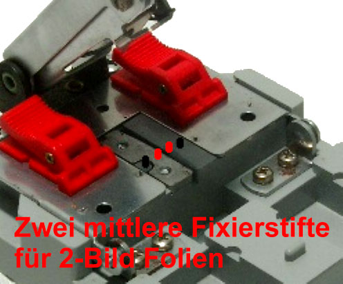 Duoplay 2/S8 Klebefolien überkleben nur 2 Bilder und sind dadurch deutlich weniger sichtbar in der Projektion. Um diese Klebefolien verwenden zu können, benötigen Sie eine Klebepresse, die insgesamt 4 Fixierstifte für die Klebefolie aufweist. Durch die zwei mittleren Stifte wird die Klebefolie fixiert. Fehlt einer dieser Stifte, können Sie die Klebepresse nicht mit 2-Bild Folien einsetzen. Bei diesen Modellen ist nur eine Verwendung der 4-Bild Folien möglich.