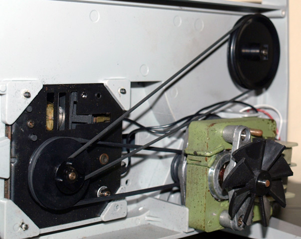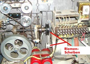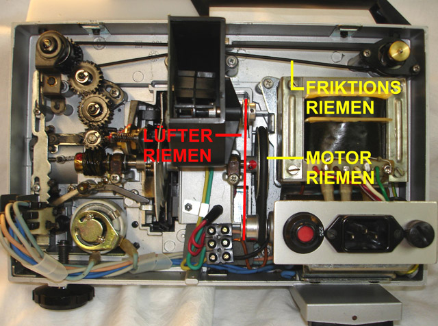 Langer, dünner Zahnriemen von Motor auf Hauptachse, für 18 oder 24 B/Sek. verwendbar. Bei Vollbestückung des Gerätes für Umschaltung 18/24 B/Sek. sind zwei Stück erforderlich.