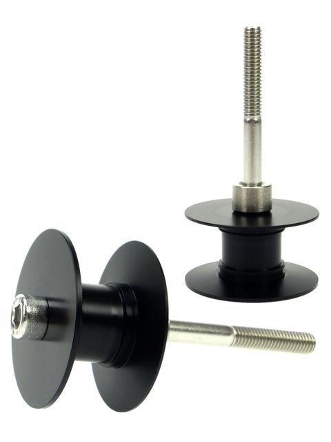 Gleitgelagerte Umlenkrolle, geeignet für 16mm Film und Super 8 / Normal 8 Film. CNC-gefertigt, aus schwarzem POM-Vollmaterial sowie mit Achsen und Befestigungsmaterial aus nichtrostendem Stahl.